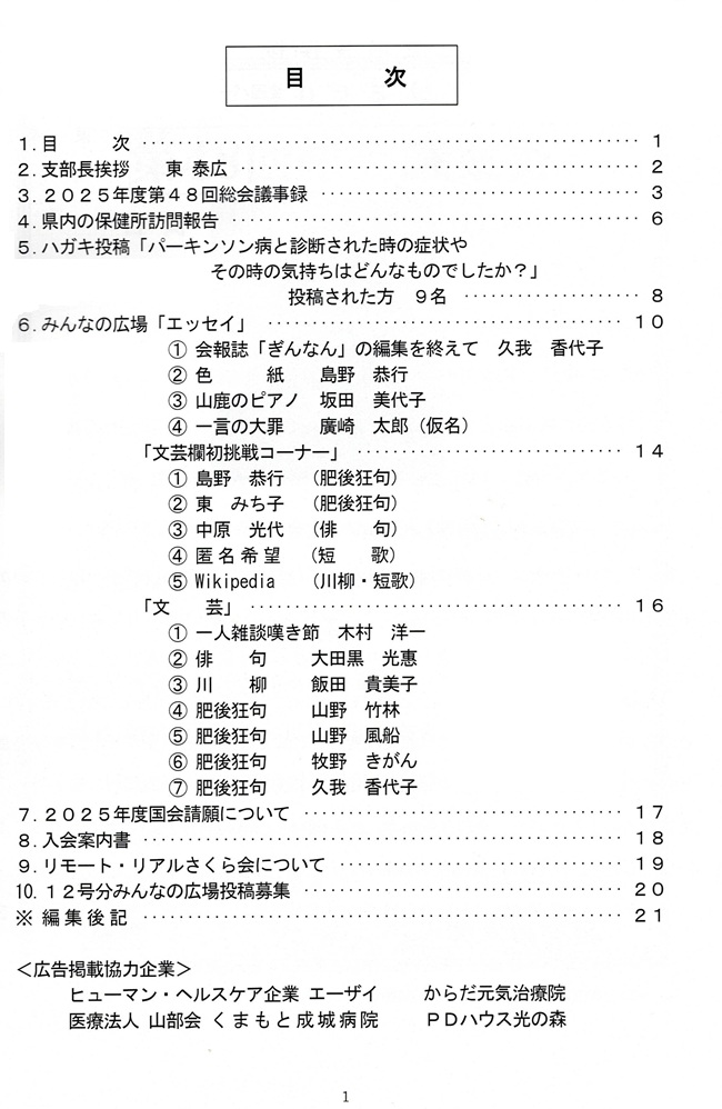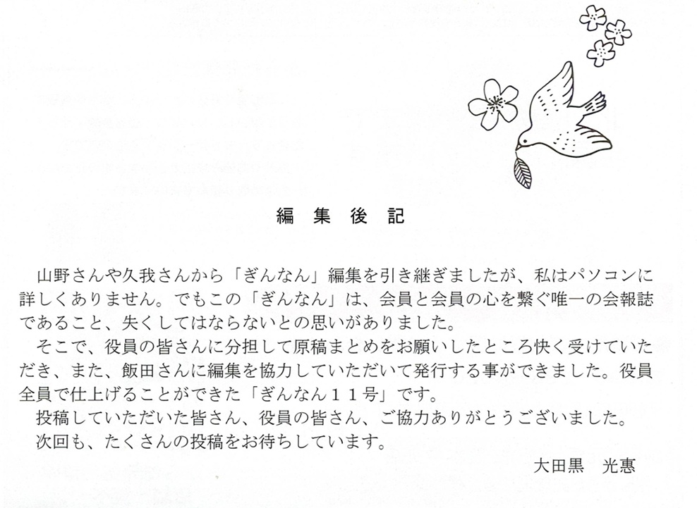 会報 ぎんなん11号 発行しました! 最新情報 2025年12月10日 みなさんのお手元には、すでに届いていると思いますが、会報「ぎんなん」11号ができました。 新 編集委員さんたちのお力で、今回も、魅力的で楽しく、役に立つ情報も満載の紙面になっています。まだの方、ぜひご覧ください。 コメント投稿フォーム コメントをキャンセルメールアドレスが公開されることはありません。 ※ が付いている欄は必須項目ですコメント ※ 名前 ※ メール ※ サイト 次回のコメントで使用するためブラウザーに自分の名前、メールアドレス、サイトを保存する。 スタジオホクラニによるフラ披露